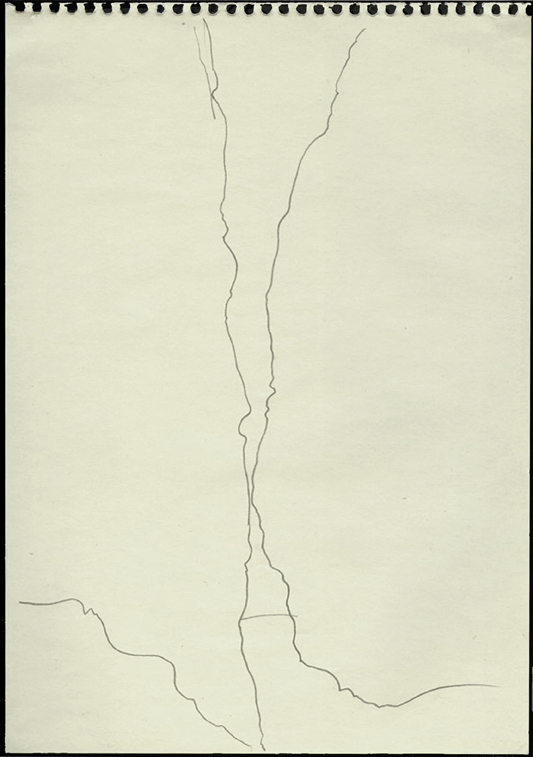 In the drawing, the primordial clarification is born from the original lyrical vision, poetic stylising ideological symbols, in seeming detours and circular returns, from the dichotomy of drawing records of inner experiences and a detailed examination of the shapes of nature. The drawing of a Slot between Two Sandstone Rocks in the Prachovské Rocks (1974) exceeds the meaning of artistic exploration of natural shapes. It is a thematisation of the experience of man in nature, experiencing the essential connection of man with nature. The gap is most significantly strangeness breaks the barrier between humans and nature. Rock reveals its interior and offers him a vision. Implies a secret contact between the seer and the seen. Seers body belongs also to what it sees, experiencing itself as both inside and outside at the same time. Being body and world as the same substance also experiences the body in seeing the world as "my" world. This feeling is not a metaphor, it is existential, although revealed in imagination. The crevice in the rocks is essentially related to the body itself. (The authenticity of such experiences is also indirectly demonstrated by Miloš Šejns attempt to sense the mystery of their mystery by reading books of Eastern philosophy, whose formulation emphasises "the body as an aspect of the mind" - H. V. Günter and Ch. Trungpa.) The drawing of the slit of 1974 is an experience of this over-substantiation of body and world and thus unintentionally reveals the basic art problem of drawing. Its space is a transformation of the reversible relationship of body and world. It is born in an area of blank paper from the tension of two lines that affect the slit as the approach of two blocks in the lap of rocks. Thus, it does not capture the objective world of bodies, but the seeing of differences, the boundaries of things in relation to the situation of sight. A line is not a feature of an object, it does not imitate visible, but "makes visible" (P. Klee). At the same time, the way the line runs through the paper space, it creates the spaciousness of the things seen as a "constituting emptiness that carries the so-called positivity of things" (M. Merleau Ponty).